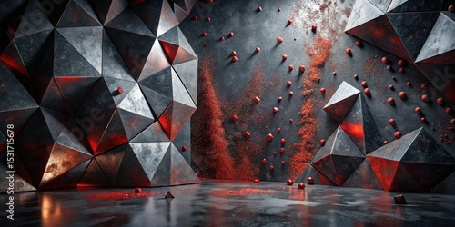 The watermark will not be included on Wall mural.: Abstract metallic polygonal structures with red powder and spheres in a dark setting
