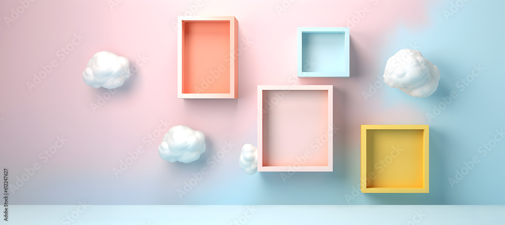 Wall mural abstract minimal concept. pastel multi colour clouds background with empty blank photo frames, abstr