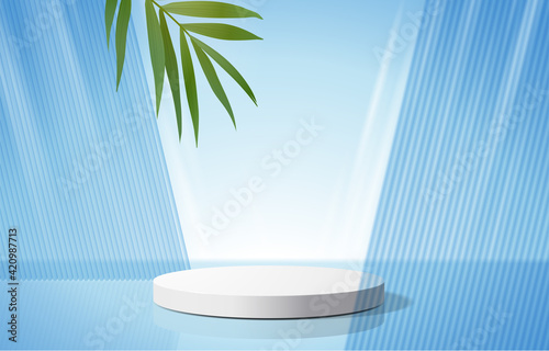 The watermark will not be included on Wall mural.: Abstract minimal scene with geometric forms - cylinder podium in blue background with leaves - product