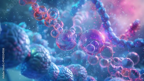 The watermark will not be included on Wall mural.: Abstract molecular structure formed by interconnected transparent bubbles with vibrant colors and a