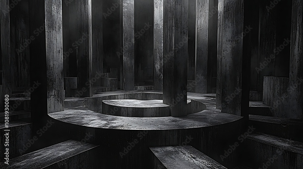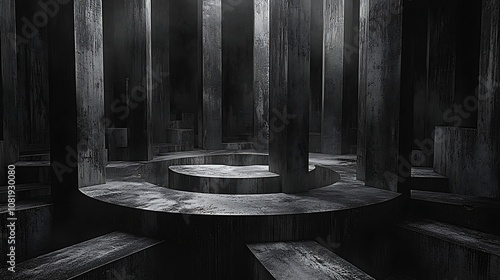 The watermark will not be included on Wall mural.: Abstract monochrome environment with tall vertical columns and circular platforms in a dark dimly li