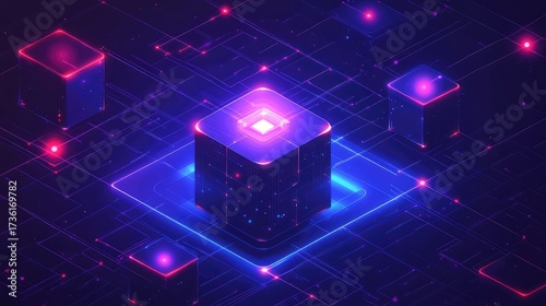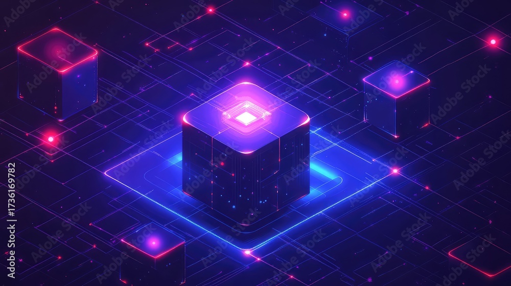 The watermark will not be included on Wall mural.: Abstract network blockchain technology connecting data server cubes