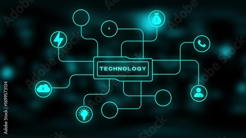 Wall mural : Abstract network diagram with the word technology in a central glowing box and teal lines connecting