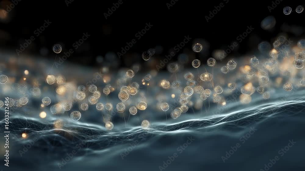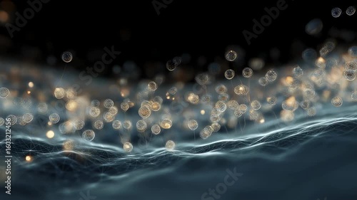 The watermark will not be included on Wall mural.: Abstract network of glowing spheres connected by thin lines rising from a wavy surface, creating a f