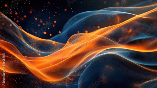Abstract orange and blue waves with glowing particles on dark background - Wall mural