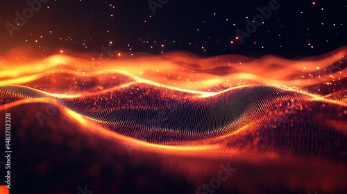 The watermark will not be included on Wall mural.: Abstract orange waves with glowing particles floating above a dark surface and a starry backdrop