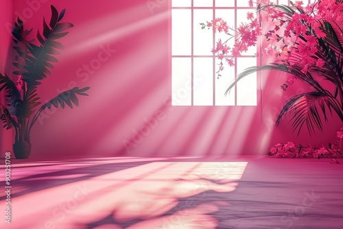 Wall mural : Abstract pink studio background with window shadows and foliage -