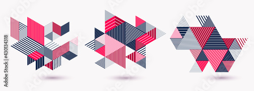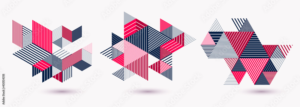 Wall mural abstract polygonal backgrounds with stripy triangles and 3d cubes vector designs set. templates for