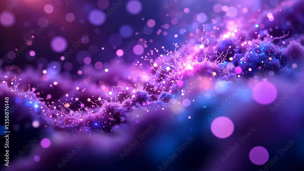 Wall mural : Abstract purple galaxy background with bokeh effect and glowing particles floating in space