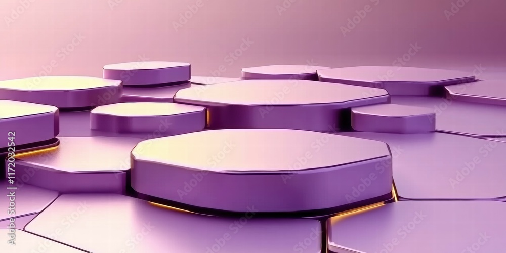 The watermark will not be included on Wall mural.: Abstract purple hexagonal shapes with glowing edges on a smooth surface -
