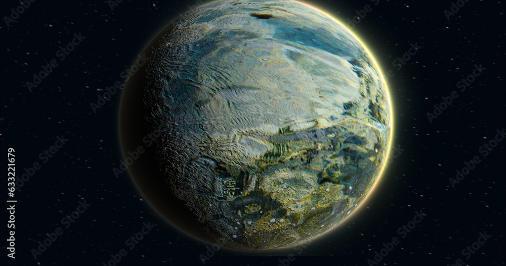 Wall mural abstract realistic space spinning planet round sphere with a water surface in space against the back - Wall murals Wall mural abstract realistic space spinning planet round sphere with a water surface in space against the back - Wall murals