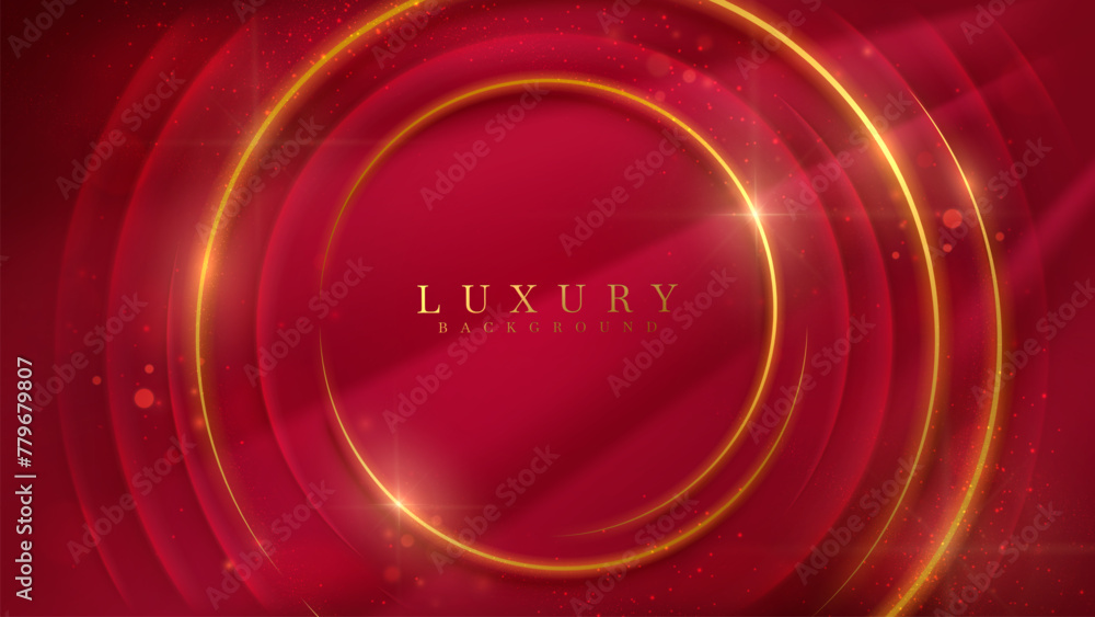 Wall mural : Abstract red background with gold glowing circles and sparkling particles for a luxurious, dynamic e