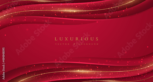 Wall mural : Abstract red background with golden wave lines and shining dots -