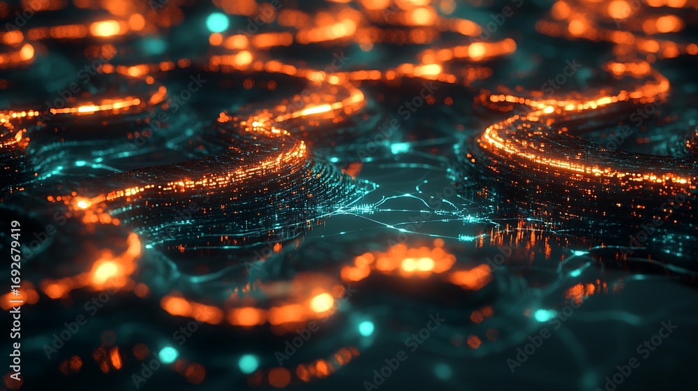 Wall mural abstract rendering of glowing orange and cyan winding structures