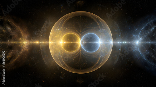 The watermark will not be included on Wall mural.: Abstract rendering of two merging spheres with golden and blue light in a dark space background