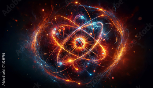 Wall mural abstract representation of an atom with electrons orbiting around a nucleus, glowing with energy and