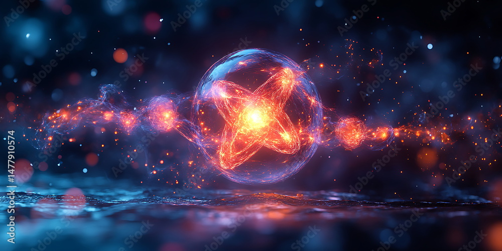 Wall mural : Abstract representation of atomic energy with vibrant plasma and particle flow on dark background fo