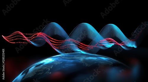 Wall mural : Abstract representation of sound waves over a globe, illustrating global communication and connectiv
