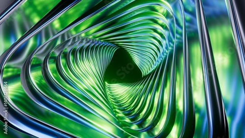 Wall mural abstract ribbed green glass background. tunnel with a rounded triangular hole at the end. 3d render