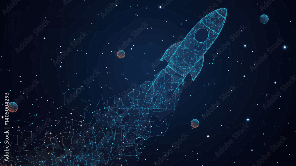 The watermark will not be included on Wall mural.: Abstract rocket launch in starry space universe with planets and stars, minimalist wireframe vector