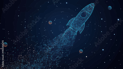 Wall mural : Abstract rocket launch in starry space universe with planets and stars, minimalist wireframe vector
