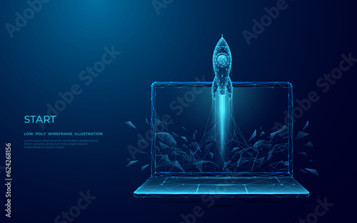 Wall mural abstract rocket takes off from the laptop screen. spaceship launch with smoke. start up and boosting