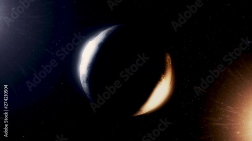 Wall mural abstract rotating planet in the shadow lighted by moon from one side and by sun from the other. anim