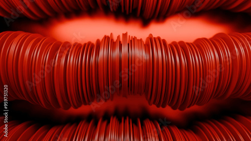 Wall mural abstract rows of red round discs slowly moving like snakes. design. 3d columns of flat round discs.
