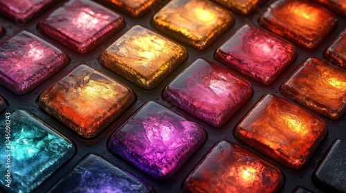 The watermark will not be included on Wall mural.: Abstract rows of translucent, colorful square gems on a dark textured background