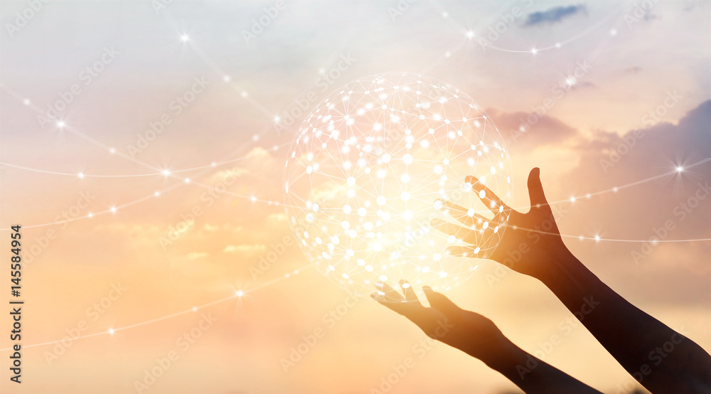 Wall mural abstract science, circle global network connection in hands on sunset background - Wall murals Wall mural abstract science, circle global network connection in hands on sunset background - Wall murals