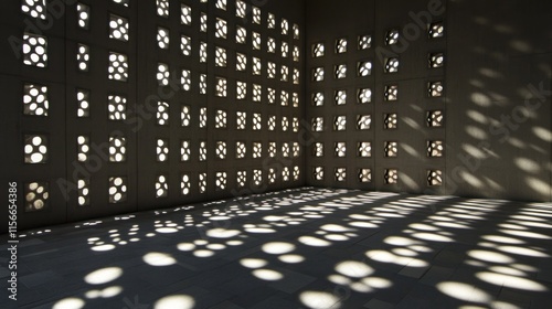 Wall mural abstract shadows and light patterns cast on floor through patterned concrete wall.