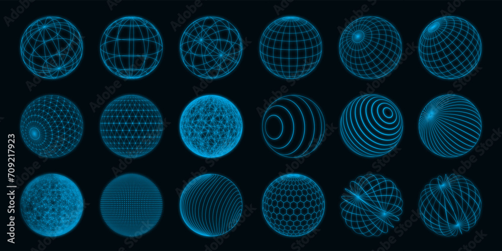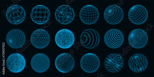 Wall mural : Abstract shapes - 3d line grid design spheres with dot particles - technology globe figure elements - n