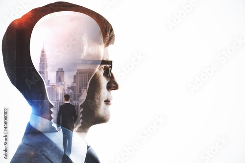 Wall mural : Abstract side portrait of businessman with light bulb abstraction on white background with mock up p