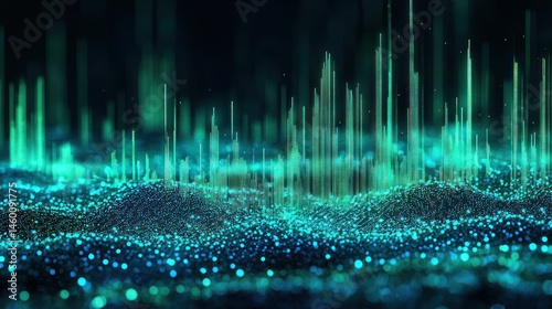 The watermark will not be included on Wall mural.: Abstract teal data visualization with glowing particles and lines forming a landscape -