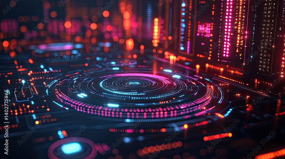 Wall mural : Abstract tech rings and glowing data points forming a futuristic system control center with sci-fi u