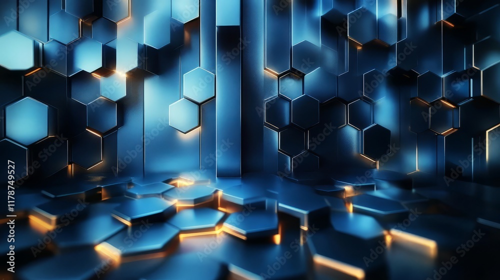 Wall mural abstract technological background with blue and golden hexagonal shapes and patterns. - Wall murals Wall mural abstract technological background with blue and golden hexagonal shapes and patterns. - Wall murals