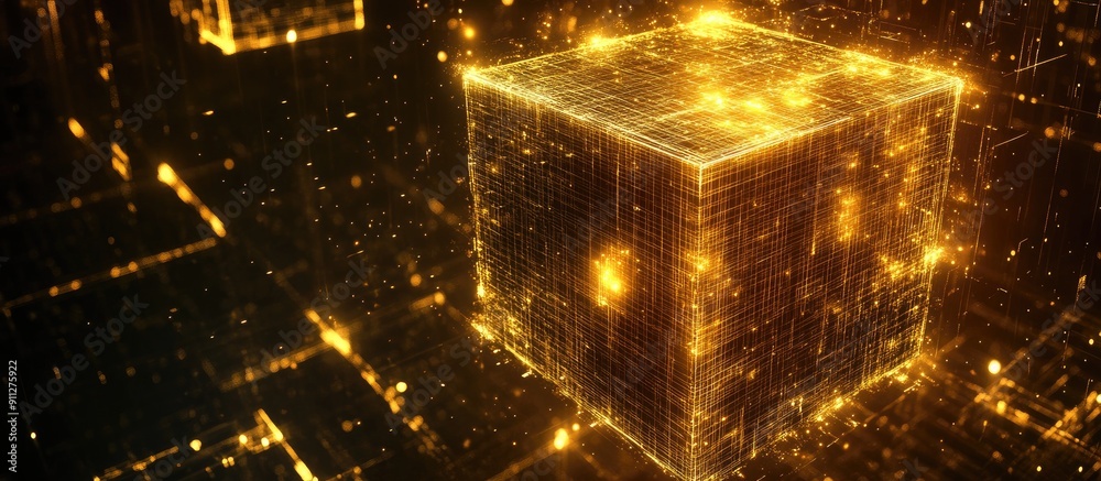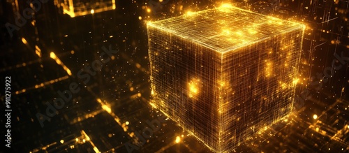 Wall mural abstract technology background featuring a golden digital box shape illuminated with light represent - Wall murals Wall mural abstract technology background featuring a golden digital box shape illuminated with light represent - Wall murals