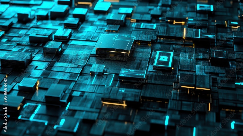 Abstract technology background featuring interconnected blue circuits and glowing elements with darkWall mural