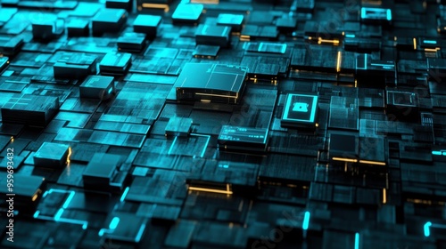Wall mural : Abstract technology background featuring interconnected blue circuits and glowing elements with dark