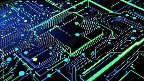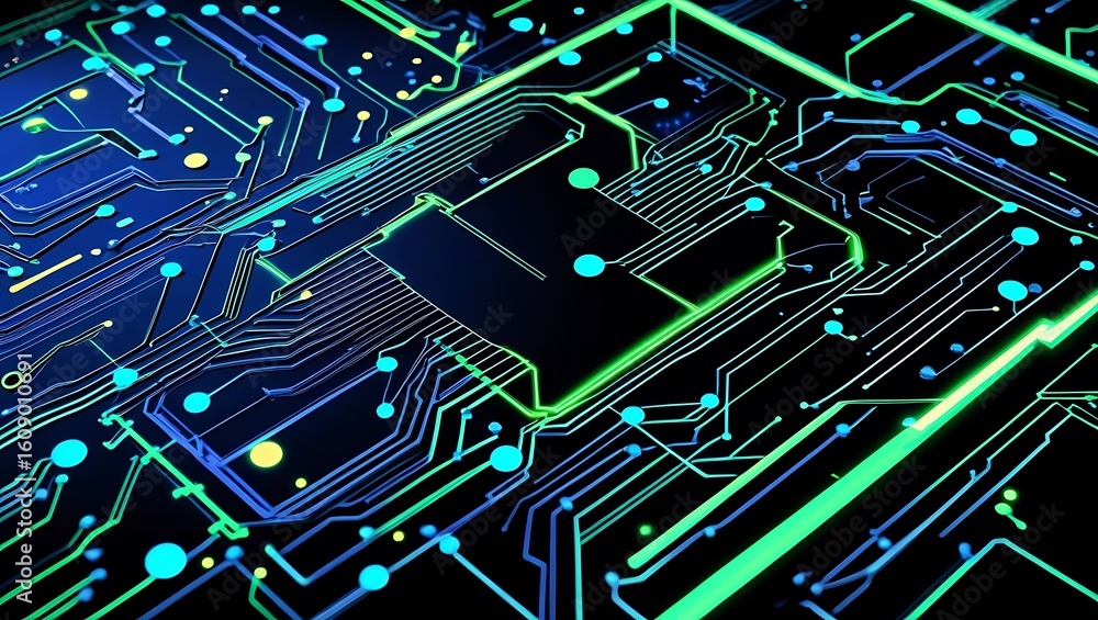 Wall mural : Abstract technology background with glowing blue and green electronic circuits representing network