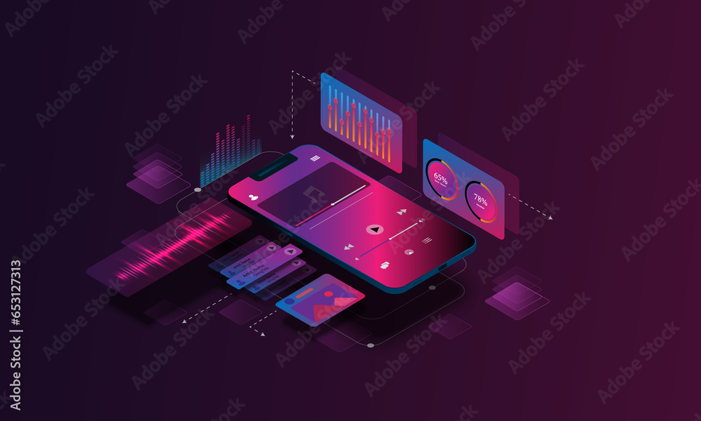 The watermark will not be included on Wall mural.: Abstract technology concept background image on smartphone, playing music and adjusting the level of