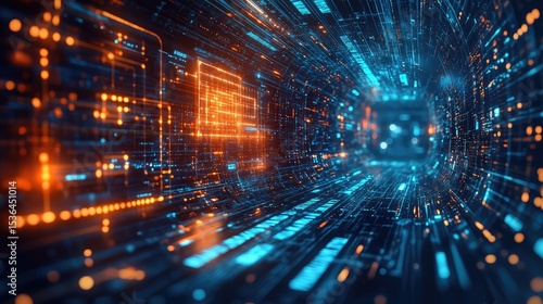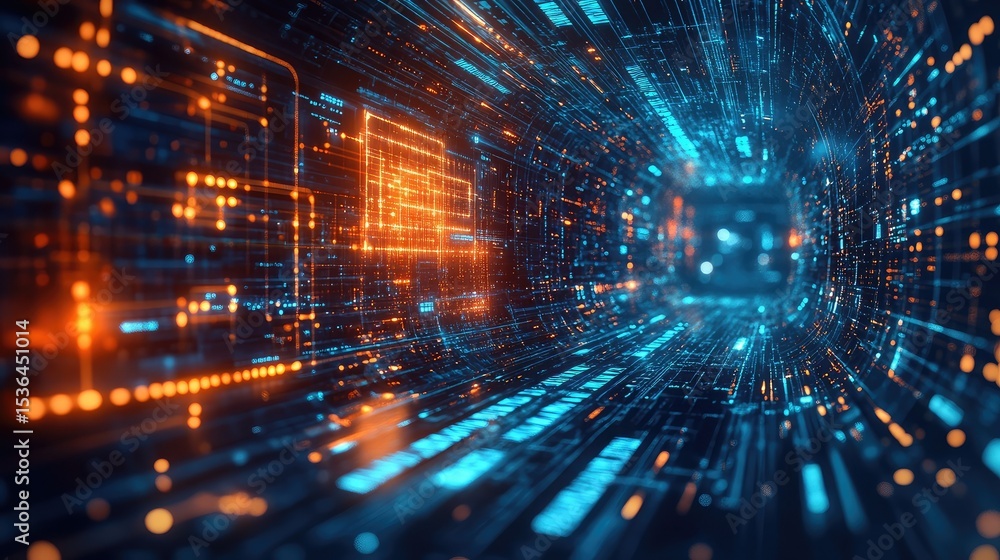 Abstract technology tunnel with glowing blue and orange lights and circuit board patterns visibleWall mural