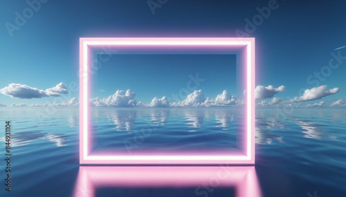 Wall mural abstract three-dimensional seascape with neon geometric elements floating in the sky, creating a sur