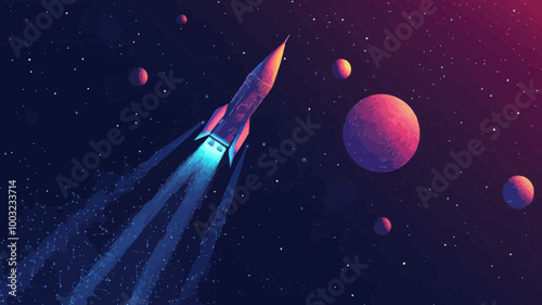 Abstract vector rocket in starry space with planets and universe elements - minimalist svg art for bWall mural