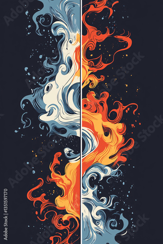 The watermark will not be included on Wall mural.: Abstract vertical illustration of intertwined fire and water elements with flowing motion and high c