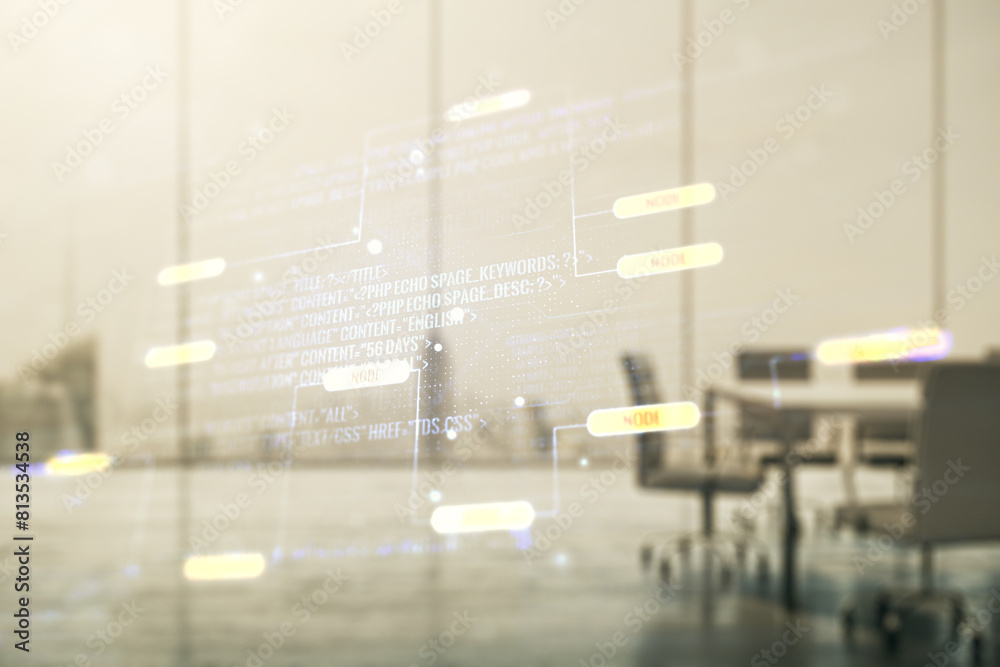 Wall mural : Abstract virtual coding illustration on a modern coworking room background, software development con
