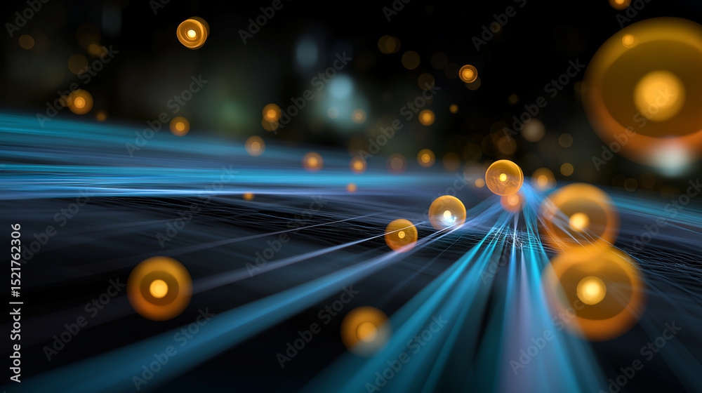 Wall mural : Abstract visualization of digital data flow with glowing orange spheres and blue lines on a dark bac