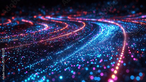 Wall mural abstract visualization: glowing particles flow across a dark plane in a pattern of interweaving blue
