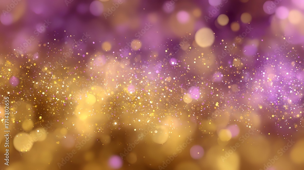 Wall mural abstract warm golden bokeh texture with tiny violet sparkles in soft dreamy celebration background