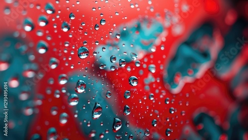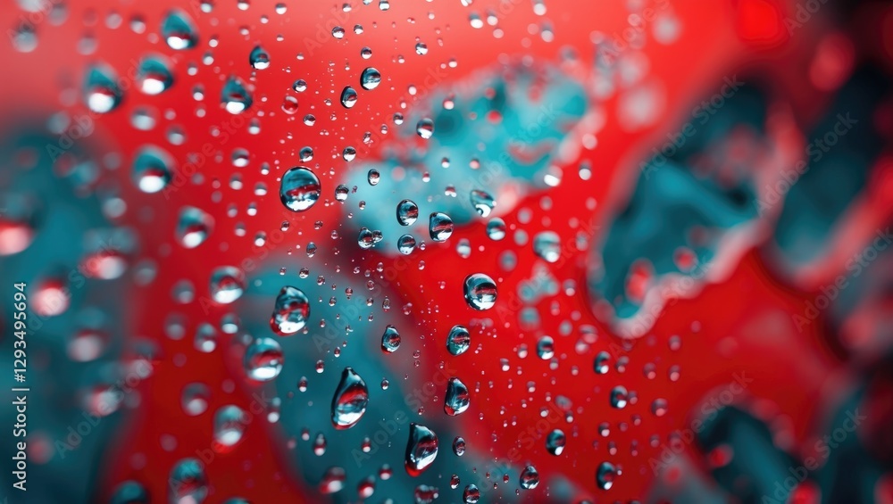 Wall mural : Abstract water droplets on glass with vivid red background and soft light reflections creating a sur